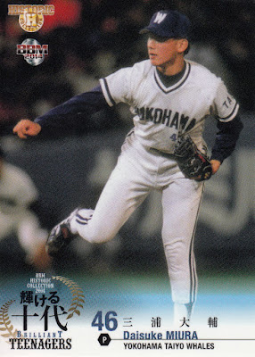 Long time Yokohama pitcher Daisuke Miura announced his retirement on September 19th. Miura was drafted out of Takada Shogyo high school in the sixth round of the fall 1991 draft by the then Yokohama Taiyo Whales (Takashi Saitoh was the first round pick). He debuted with a two inning appearance against the Giants on October 7, 1992. He was the final Yokohama Taiyo Whale still playing as the Whales changed their name to the Baystars that offseason. While he didn't have any cards showing him with the Whales in 1992, there have been a couple since then showing him in their uniform:
