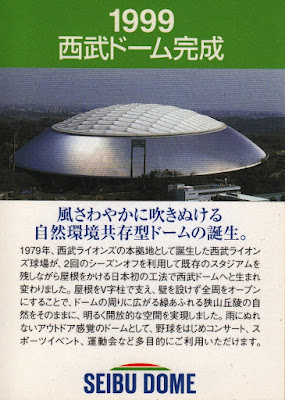 I don't know if this card was part of an actual set or just some sort of promotional card for the Lions. It appears to be related somehow to the opening of the Seibu Dome (the ballpark opened in 1979 but didn't have a roof on it until 1999).