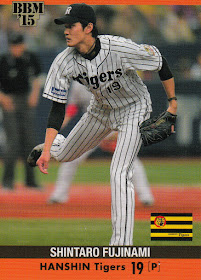 Here's a card of Fujinami from the 2013 BBM Tigers set.  That set had a six card "Fujinami Special" insert set featuring highlights of Fujinami's first season (or really first couple months).  Here's one of the cards (#FS5) commemorating something that happened on May 5, 2013 - not sure what, as the back of the card indicates that the Swallows won the game 7-5.: