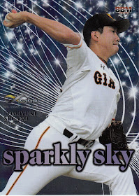 Ryan included a couple of the "Sparkly Sky" insert cards from this set and they show that BBM continued being lazy in the images they used - they are the same ones as from the player cards. And it's on the back of the insert card as well. So that image of Sugano is used six times total on the front and back of three cards - on his "regular" player card, his "Family Ties" card and his "Sparkly Sky" insert card: