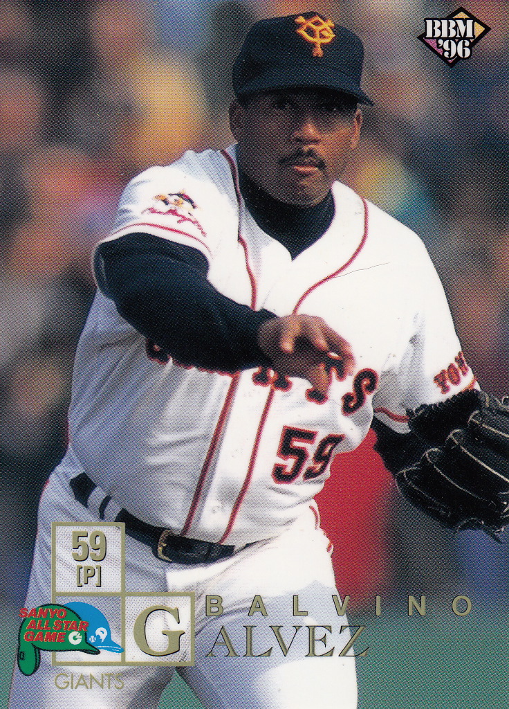 Balvino Galvez spent 12 seasons mostly in the minors for the Dodgers, Tigers, Twins, Expos, Yankees and Cubs between 1982 and 1993. He got into 10 games with the major league Dodgers in 1986, going 0-1 with a 3.92 ERA. He came to Japan in early 1996 after spending two seasons with the Brother Elephants of the CPBL and signed a contract with the Yomiuri Giants on February 22 which I assume is after that year's flagship set went to press. Galvez went 16-5 with a 2.55 ERA that year, tying for the league lead in victories with his teammate Masaki Saitoh. Galvez pitched in the Nippon Series that year and so appears in BBM's Nippon Series set as well. (Given that the Nippon Series sets feature all the players who appear in the Series it is not that unusual for a player to appear in the Nippon Series box set but not appear in the flagship set.)