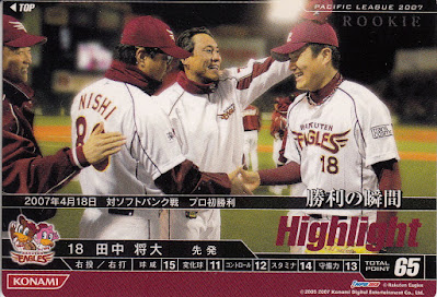 Here's a card celebrating Tanaka's first ever victory in NPB on April 18th, 2007, 14 years ago today, from the "Highlight" subset of the 2007 Konami Baseball Heroes 3 set (#B07H006):