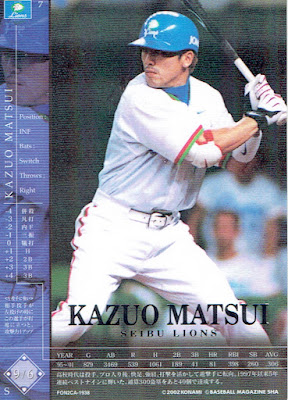 Konami introduced the "Baseball Heroes" line in 2005 and I believe they continued it until they took several years off from from doing baseball games and cards in the mid 2010's, stopping in either 2013 or 2014. These cards were used somehow in a video games although I'm not sure if they were online or in arcades. The big difference with these cards is that there was player information on both sides of the cards. There were a dizzying number of sets issued each year - "White Edition", "Black Edition", "Power Up Version" and "Opening Version" were some examples - and after a while it got hard to keep track of them.